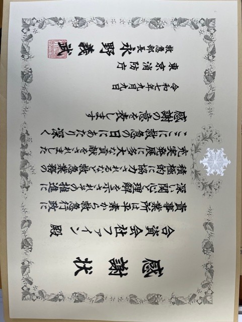- 2025.10東京消防庁より感謝状をいただきました。